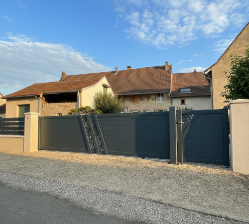 À Chalon-sur-Saône, le propriétaire d’une ferme traditionnelle a fait appel à David Lonjaret, Expert Burgermeister et responsable de l’entreprise Les Portails de Bresse, pour repenser l’entrée de sa propriété. Le défi ? Installer un portail moderne KSM Production devant une bâtisse ancienne au caractère affirmé et avec une grande cour traditionnelle. David Lonjaret a rapidement orienté le client vers un design contemporain en aluminium, en proposant le modèle coulissant Mauka avec une tôle personnalisée motif Dalhia ainsi qu’un portillon Solano assorti.