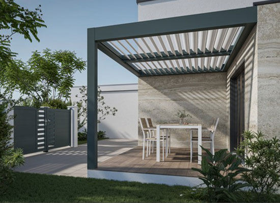 Le mobilier bas répond parfaitement à cette évolution. Il abaisse la perspective, agrandit l’espace et invite à la détente immédiate. Installé sous une pergola architecturale, il compose un véritable salon d’extérieur où l’on se sent à l’aise, même en pleine chaleur. Les pergolas bioclimatiques en aluminium, comme la Elena, jouent ici un rôle essentiel : lames orientables, motorisation discrète, gestion fine de l’ombre… Elles permettent d’adapter l’ambiance selon l’heure et la météo, un atout majeur pour profiter du jardin toute l’année.